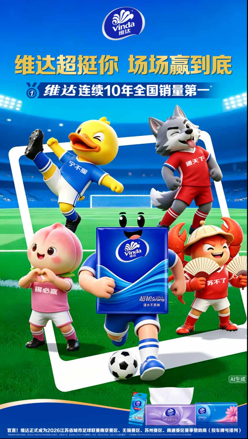 4月8日,生活用紙領導品牌維達正式官宣,再度攜手現象級全民足球賽事——江蘇省城市足球聯賽(以下簡稱「蘇超」),成為2026賽季蘇超聯賽南京、無錫、蘇州、南通四大賽區賽事贊助商(按照車牌首字母順序排列)。